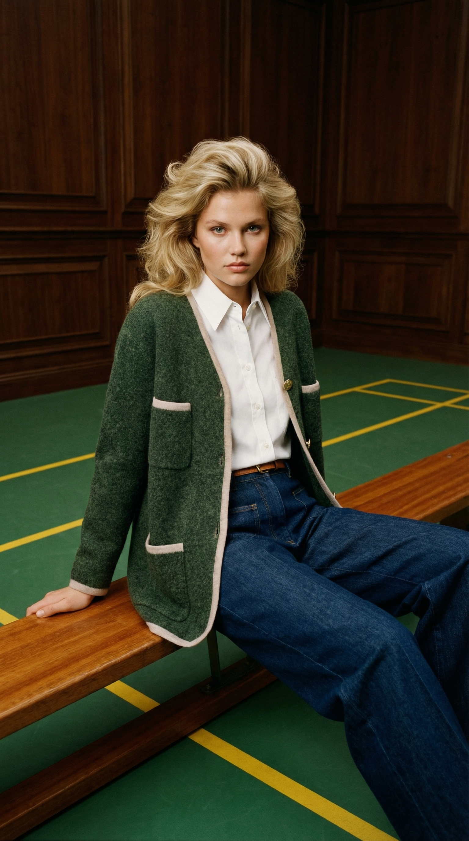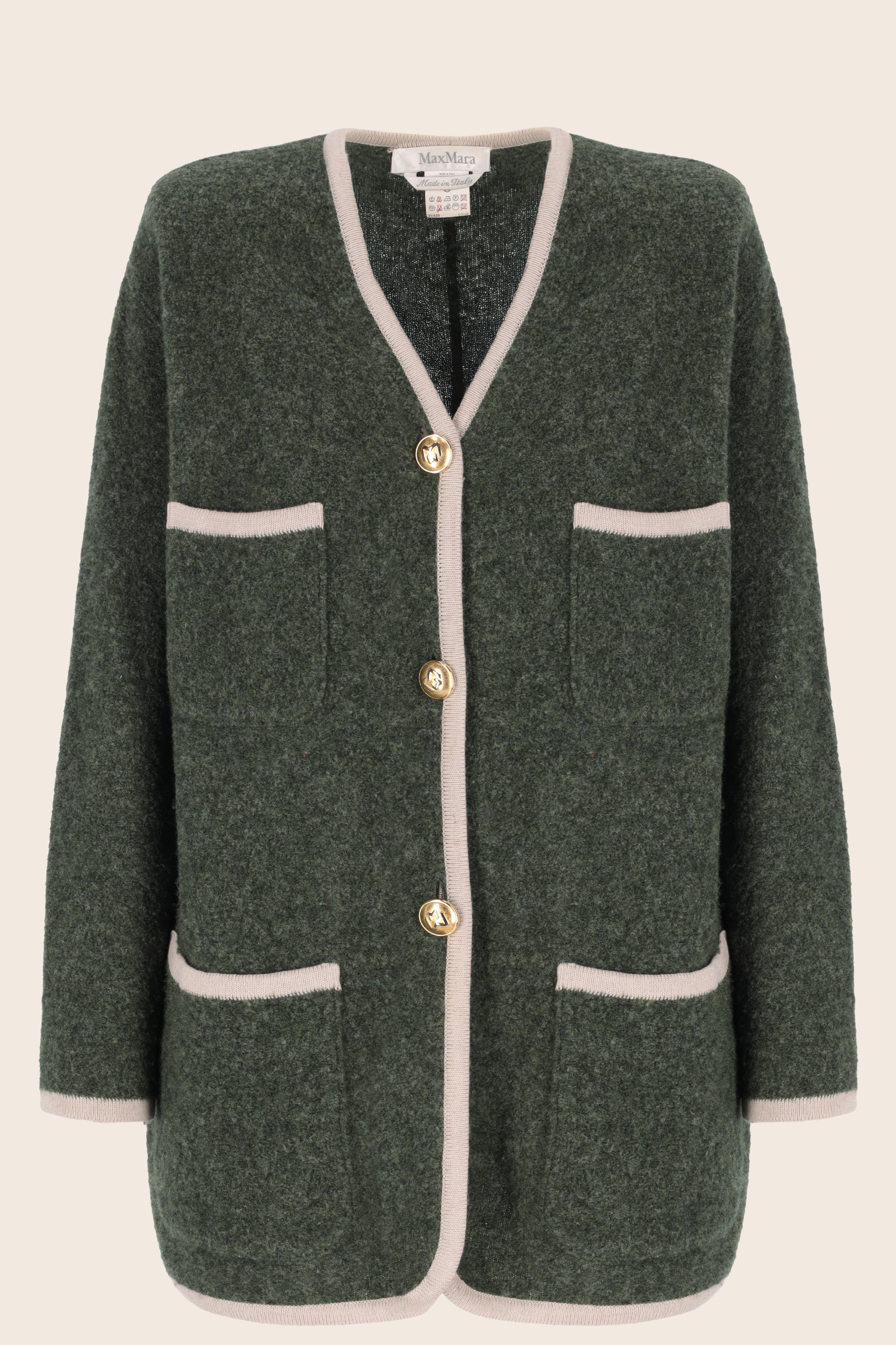 Details: golden buttons, Contrasting color borders, Shoulder pads
